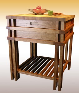 Check out client Sawbridge Studios‘ innovative Swiss Army Knife Kitchen Island, which quadruples as a chopping block, marble pastry slab, breakfast bar, and computer work station/desk. There’s also plenty of extra storage space from two spacious drawers, and bottom shelf perfect for cookware. Made from cherry, maple and marble. 30″ x 30″ x 36″ H, extends to 58″. Designed and built by husband and wife woodworkers Mike and Emily Kincaid of the tiny, 200-year-old town of Mt. Vernon, Ohio, the Swiss Army Knife Kitchen Island is available exclusively in Chicagoland at Sawbridge Studios.