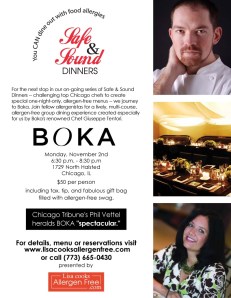 Tickets for the Safe & Sound Dinner at Boka are $50 per person, require advance reservations, and include a complete, multi-course dinner, including all tax and gratuity, plus a fabulous, filled-to-the-rim VIP gift bag of allergen-free swag.