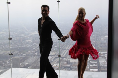 Professional ballroom dancers from Chicagoland Fred Astaire Dance Studios recently took dancing to new heights, as they stepped onto THE LEDGE AT SKYDECK CHICAGO to perform a sky-high Salsa at a mind-boggling 1,353-feet over the city of Chicago…..as camera crews from all major Chicago TV outlets captured every minute of action — 103-stories in the air.