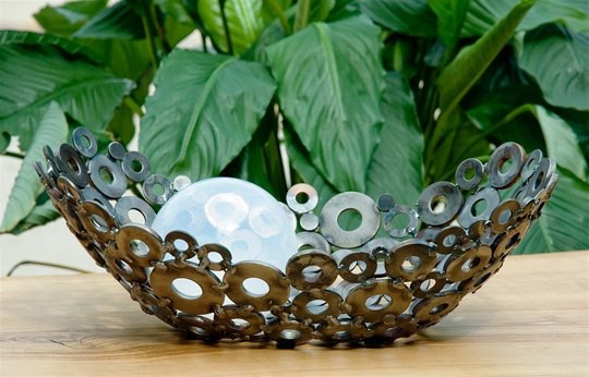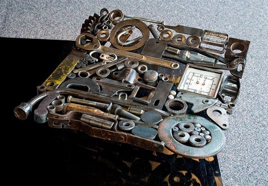 Tammy now spends hours combing through scrapyards, discovering and reclaiming the industrial objects that inspire her one-of-a-kind, heavy-metal masterpieces. Working in a medium of nuts, bolts, washers, hinges, metal tools and gages, Tammy carefully arranges and fuses each creation, breathing new life into discarded everyday objects transformed into detailed and amazing sculpture.