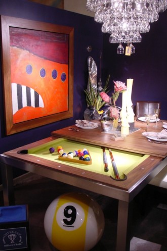 Made by Belgium-based billiards powerhouse Aramith — the Rolls Royce of billiards — and available exclusively in Chicago-area market at Design, Inc. — the Fusion Table seamlessly transforms from Rack of Lamb to Rack ’em Up. With secret lift-out tabletop panels and legs adjusting from standard 29-inch table height to 32-inch billiards height, the transformation’s complete in mere seconds