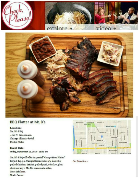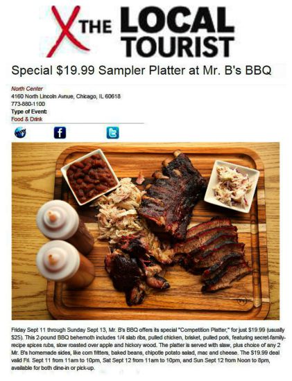 Since quietly opening late spring, Mr. B’s BBQ has been busy racking up ribs, along with throngs of followers, at its Lincoln Avenue location in Chicago’s North Center neighborhood. With indoor seating for just 20, an additional 14 on its outdoor patio, this tiny, family-owned BYOB is creating plenty of big buzz…and big flavor. Featuring secret family recipe spice rubs and sauces, Mr. B’s BBQ ribs, pork, chicken and brisket are smoked low and slow daily in-house, over apple and hickory wood.