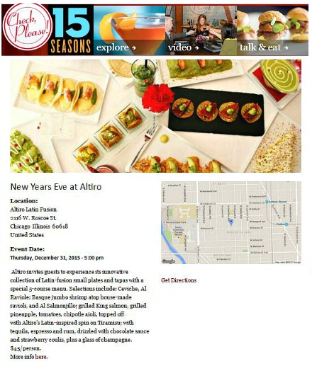 Altiro’s New Year’s Eve Menu is $45 person, and includes complimentary glass of champagne. Advance reservations are required. Altiro Latin Fusion is located at 2116 West Roscoe Street, Chicago, 773-935-4000.