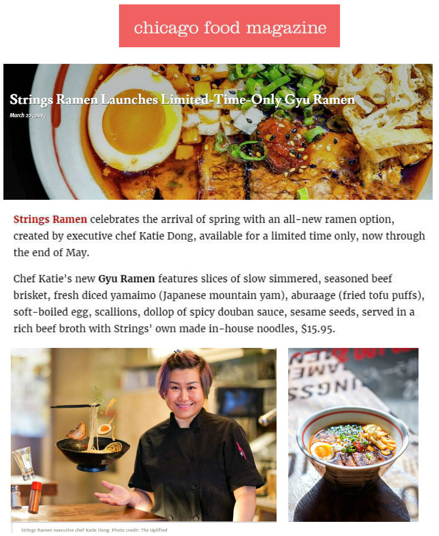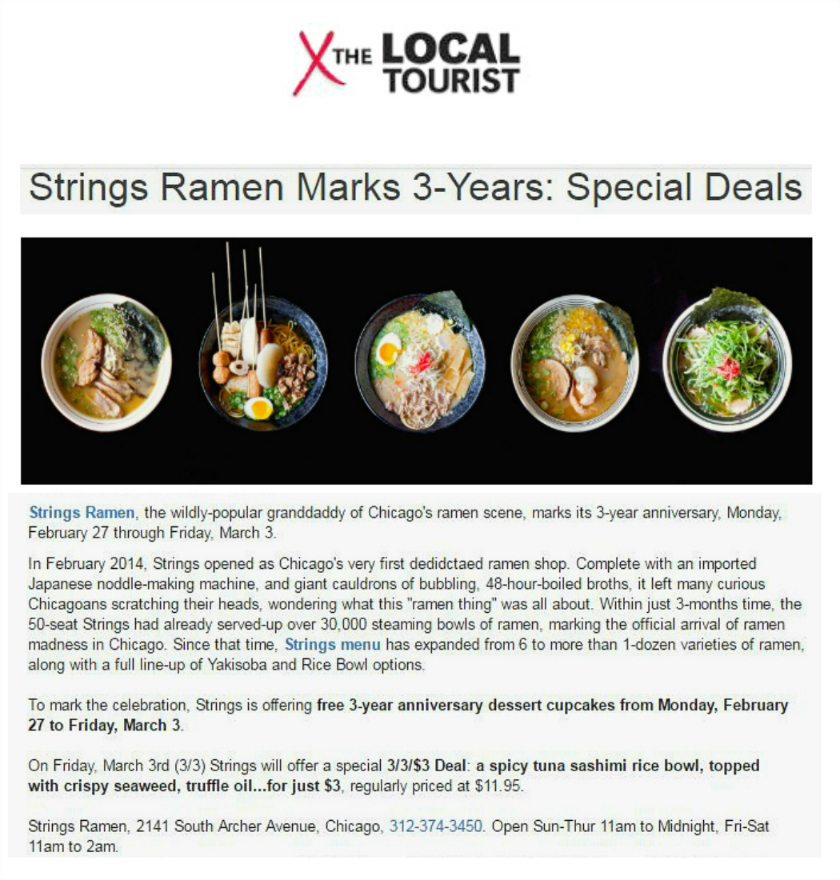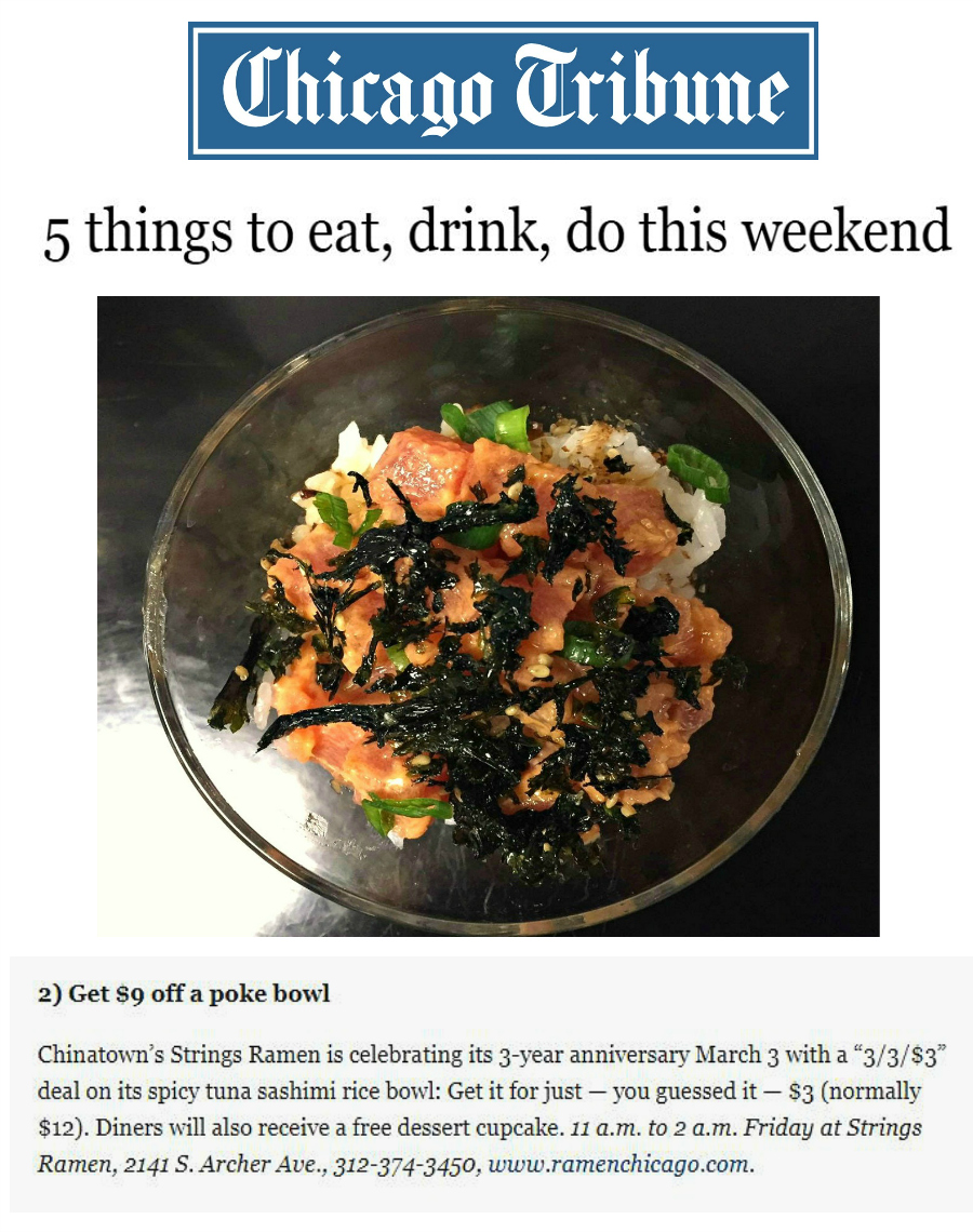 Strings Ramen, the wildly-popular granddaddy of Chicago’s ramen scene, marks its 3-year anniversary, Monday, February 27 through Friday, March 3. In February 2014, Strings opened as Chicago’s very first ramen shop. Complete with an imported Japanese noddle-making machine, and giant cauldrons of bubbling, 48-hour-boiled broths, it left many curious Chicagoans scratching their heads, wondering what this “ramen thing” was all about. Within just 3-months time, Strings had already served-up over 30,000 steaming bowls of ramen, marking the official arrival of ramen madness in Chicago. Since that time, Strings’ menu has expanded from 6 to more than 1-dozen varieties of ramen, along with a full line-up of Yakisoba and Rice Bowl options.