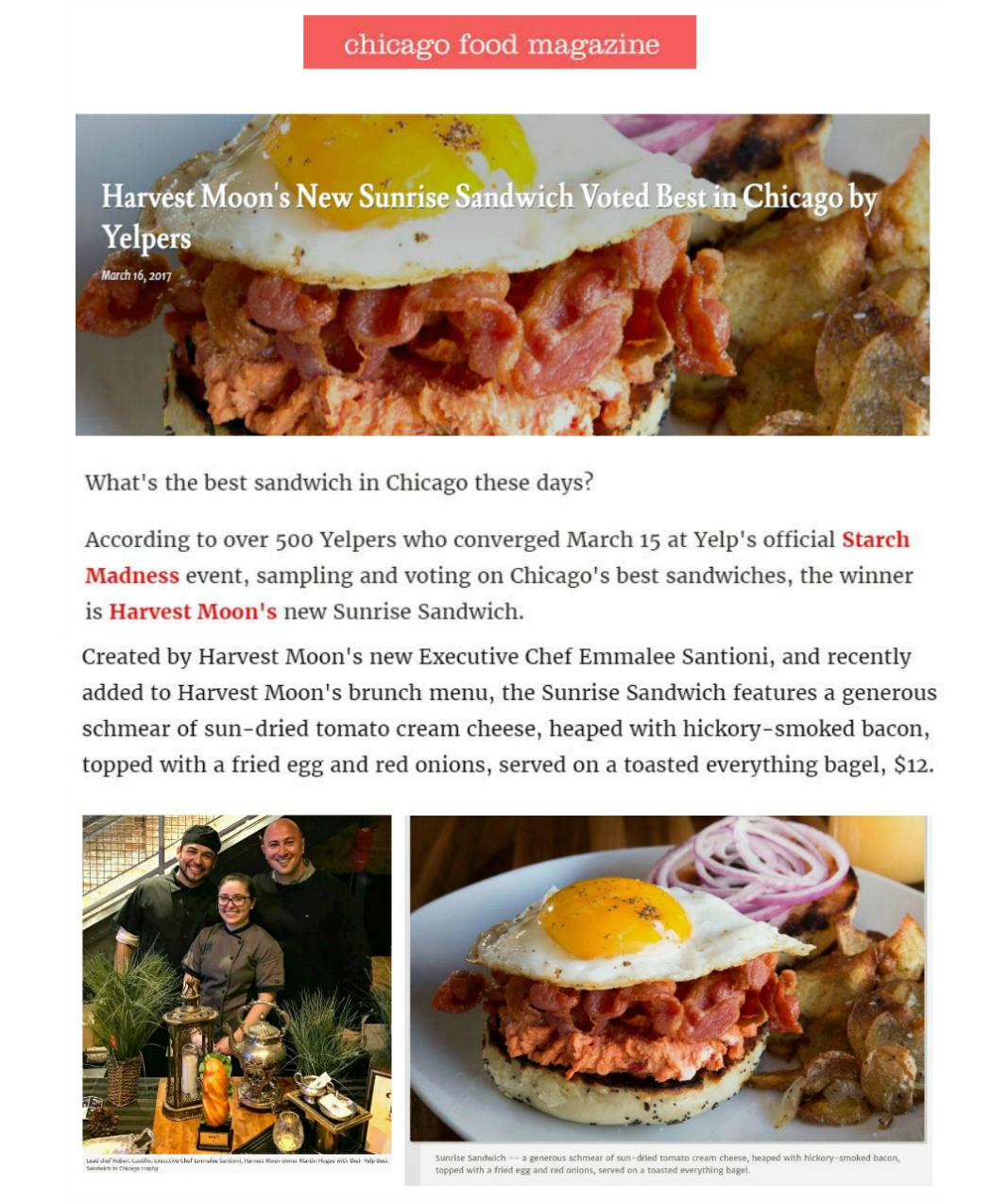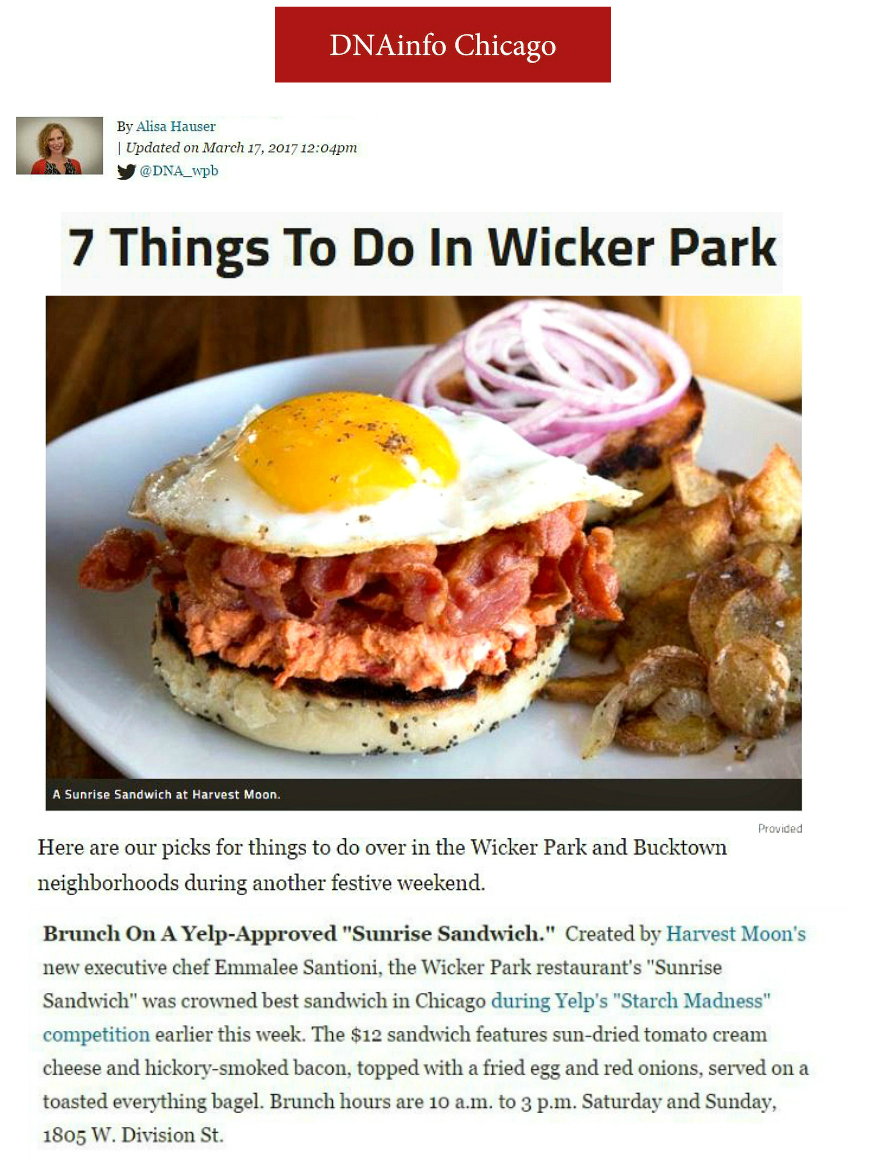 According to over 500 Yelpers, who converged at Yelp-sponsored Starch Madness to taste-test and vote on Chicago’s best sandwich, the winner is Harvest Moon’s new Sunrise Sandwich. Created by Harvest Moon’s Executive Chef Emmalee Santioni, and added recently to Harvest Moon’s brunch menu, the Sunrise Sandwich begins with a generous schmear of sun-dried tomato cream cheese, heaped with hickory-smoked bacon, topped with a fried egg and red onions, served on a toasted everything bagel, $12. Opened since August in Wicker Park, Harvest Moon provides an artsy-chic vibe, with over-sized banquettes, bold hand-painted murals, a rotating seasonal menu of dinner, brunch, and late-night favorites, all under the soft glow of Edison lamps and flickering candles.