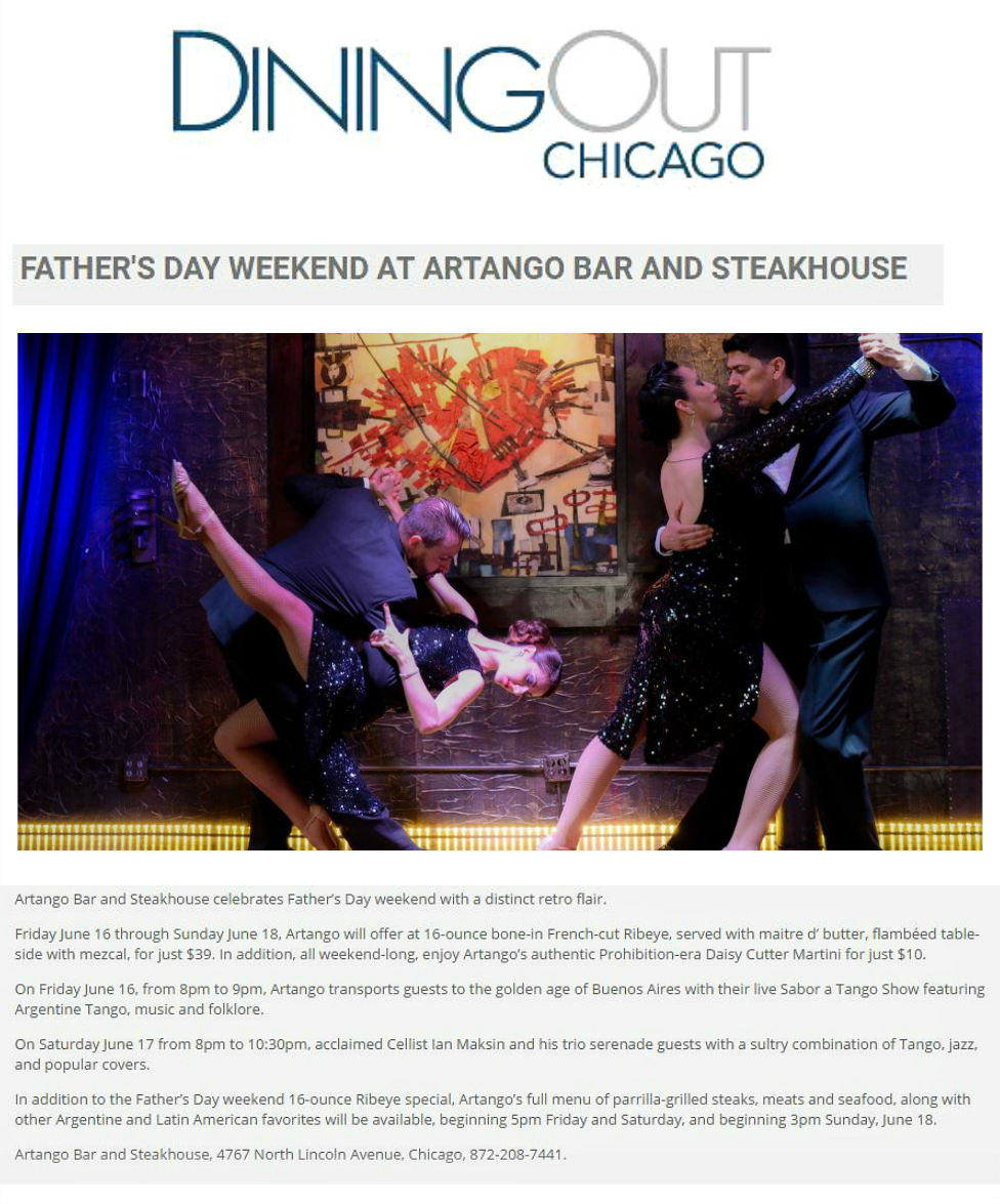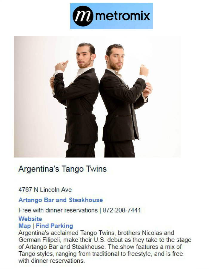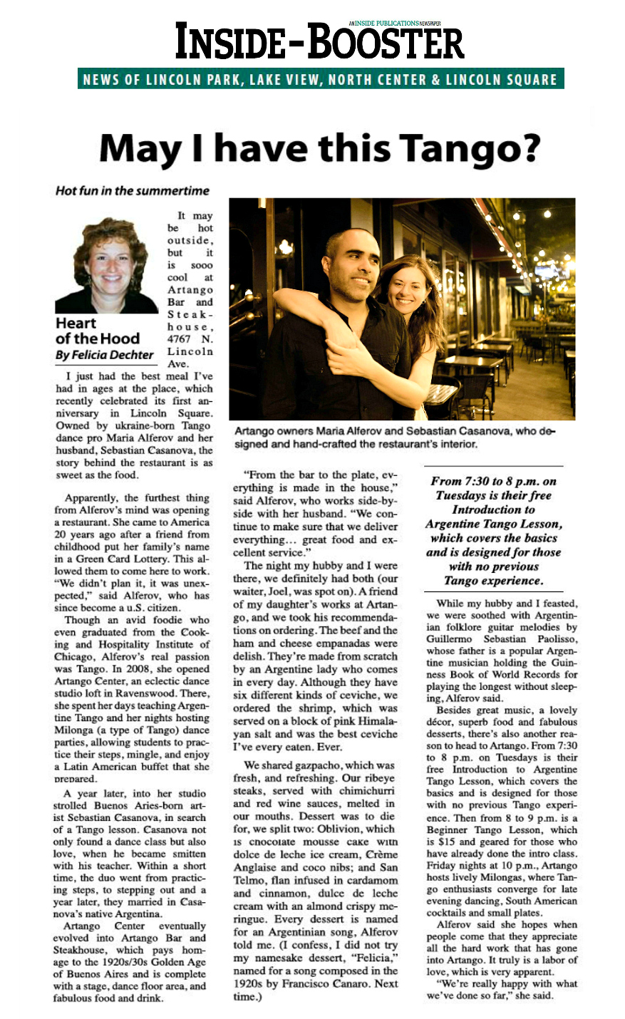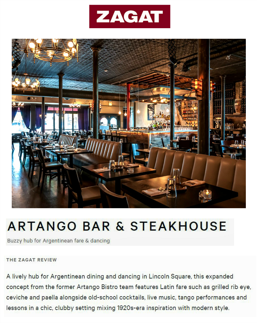 Artango Bar and Steakhouse has become a lively hub for Argentinean dining, dancing, and live music since expanding to Lincoln Square in April 2016. Recently featured on Check Please, Artango draws inspiration from the 1920s Golden Age of Buenos Aries, with prohibition-era cocktails, authentic parrilla-grilled steaks, meats and seafood, along with other Argentine and Latin American favorites. Artango now also features a rotating weekly showcase of live entertainment, including pro Tango dancers, musicians, singers, Flamenco dancers, and beginner Tango lessons.