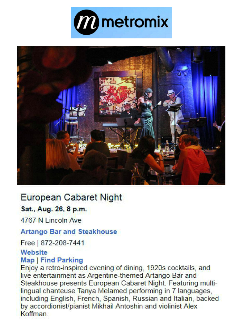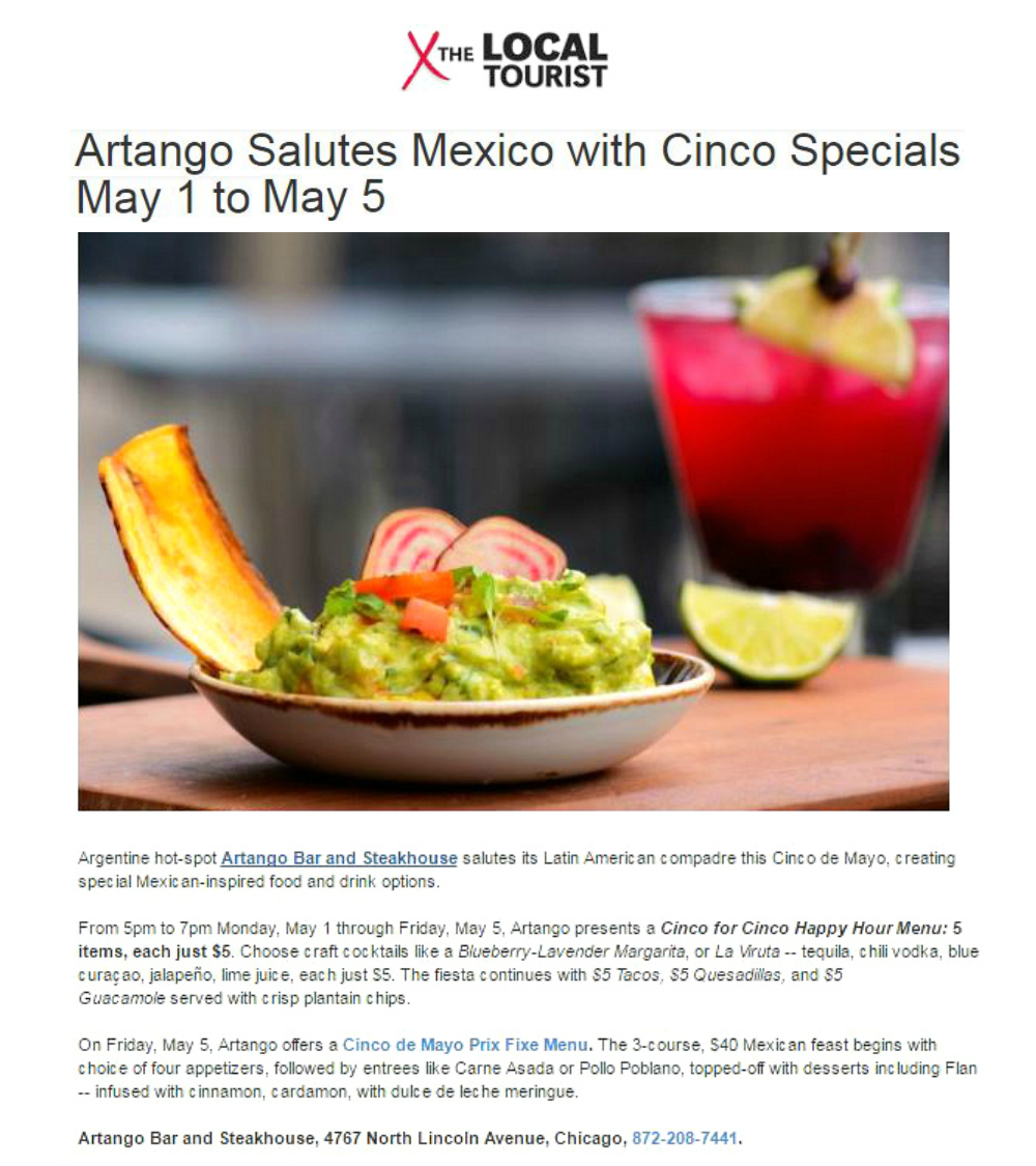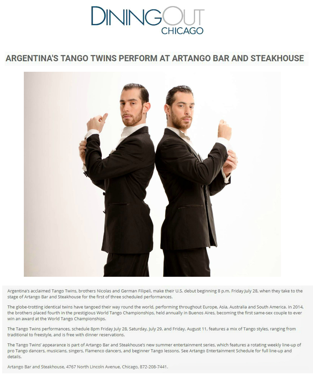 Artango Bar and Steakhouse has become a lively hub for Argentinean dining, dancing, and live music since expanding to Lincoln Square in April 2016. Recently featured on Check Please, Artango draws inspiration from the 1920s Golden Age of Buenos Aries, with prohibition-era cocktails, authentic parrilla-grilled steaks, meats and seafood, along with other Argentine and Latin American favorites. Artango now also features a rotating weekly showcase of live entertainment, including pro Tango dancers, musicians, singers, Flamenco dancers, and beginner Tango lessons.